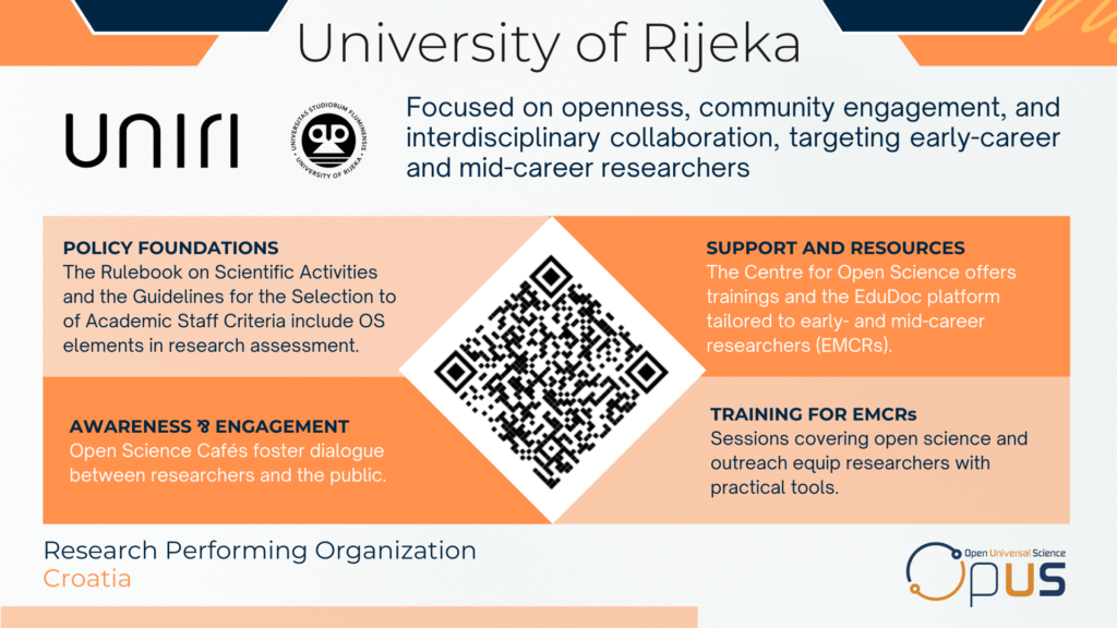 The timing of OPUS has been particularly beneficial for University of Rijeka, coinciding with efforts to update its Human Resources Strategy for Researchers (HRS4R) Action Plan. Activities under OPUS have been coordinated with other projects such as COARA Boost Project OSCAR, launched in collaboration with the University of Cyprus.